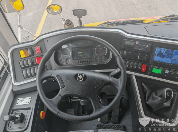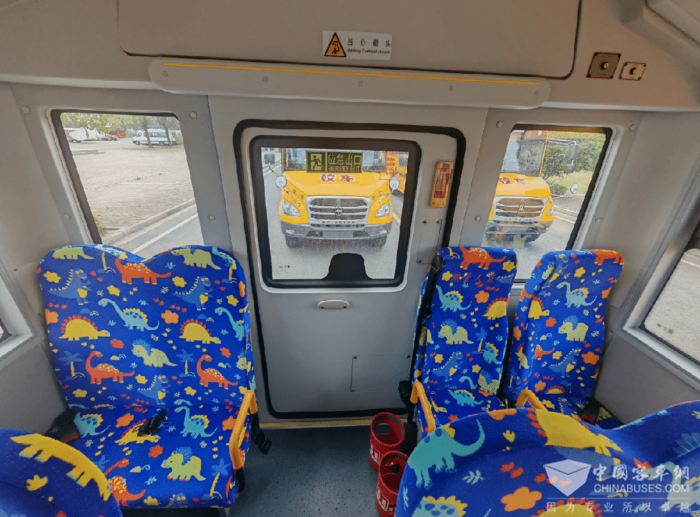 前置遥控外摆式气动乘客门,带智能防夹功能,上下透明玻璃,增加视野,减少盲区,行车更安全。车内在后围安全门附件位置安装“防遗忘”装置(安全巡视按钮),谨防学生遗落车上。