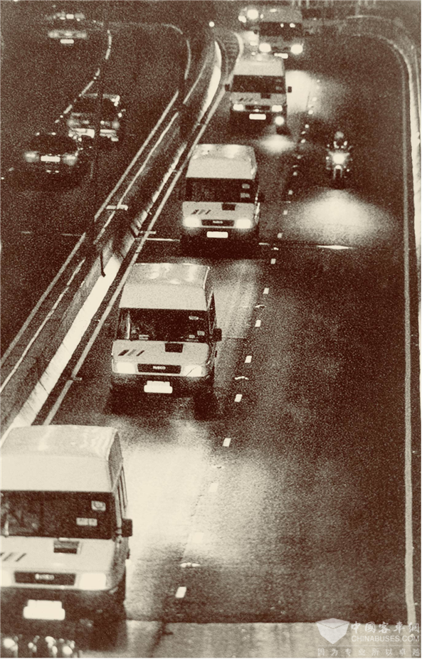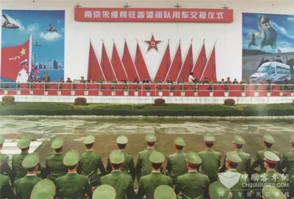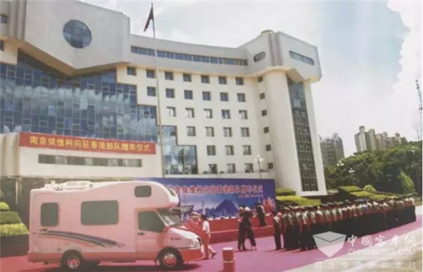 1997年7月1日,中央电视台对香港回归中英政权交接仪式全过程直播,南京依维柯也组织全体员工们进行了收看。当零点钟声敲响,中方指挥官一声令下,电视中出现了跟随在指挥车之后,一辆接一辆白色的依维柯轻客“排队”过关进驻香港的画面,当时30辆车一共载了510名驻港部队官兵。看着这激动人心的一幕,远在南京的依维柯工厂里响起了经久不停的欢呼。