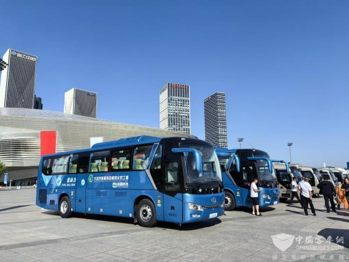 本届论坛绿意盎然,除了主会场实现100%“绿电”供应,80%服务保障车辆为新能源汽车,其中,有二十辆氢动力驱动的巴士往返于市区与会场之间,为大连和本届论坛注入清洁动力,也展示着中国新能源行业多元化发展的活力。其中,就有金旅凯歌车型与考斯特车型。