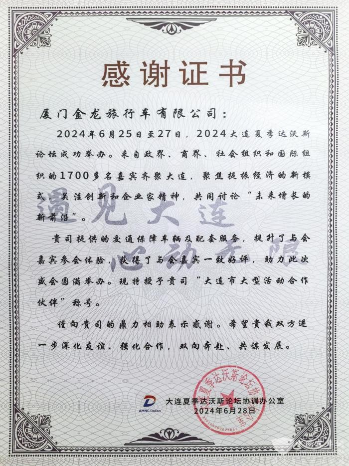 近日,大连夏季达沃斯论坛协调办公室发来感谢信,感谢金旅客车在论坛期间提供的保障车辆及配套服务,提升了与会嘉宾参会体验,获得了与会嘉宾一致好评,助力此次盛会圆满举办。