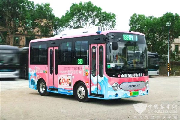 实际上,这条特色线路以安凯纯电动G6为运营载体,该车短小精悍,灵活机动,在外观设计上,以“山海有信,爱在普陀”为主题,粉色车身点缀蓝白相间的海浪元素,整体设计别具一格,每一处细节都在诉说着美好与温情,将浪漫气息与山海美景完美地融合在一起。