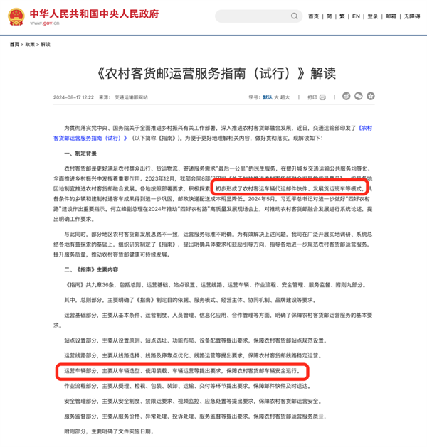 交通运输部运输服务司相关负责人表示,农村客货邮是更好满足农村群众出行、货运物流、寄递服务需求“最后一公里”的民生服务,在提升城乡交通运输公共服务均等化、全面推进乡村振兴中发挥着重要作用。