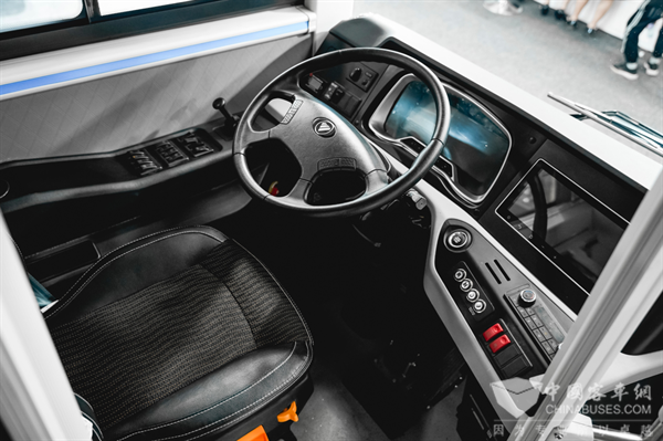 驾驶区采用隔离屏蔽门,可为驾驶员创造一个无干扰的驾驶环境,提升公交运营安全。主驾气囊减震座椅软硬适度,具备多项调节功能,支撑性和包裹性都十分到位,大大缓解驾驶员长时间驾车疲劳感。驾驶工作台为半环绕设计,功能按键环绕驾驶员四周,驾驶操作触手可及。