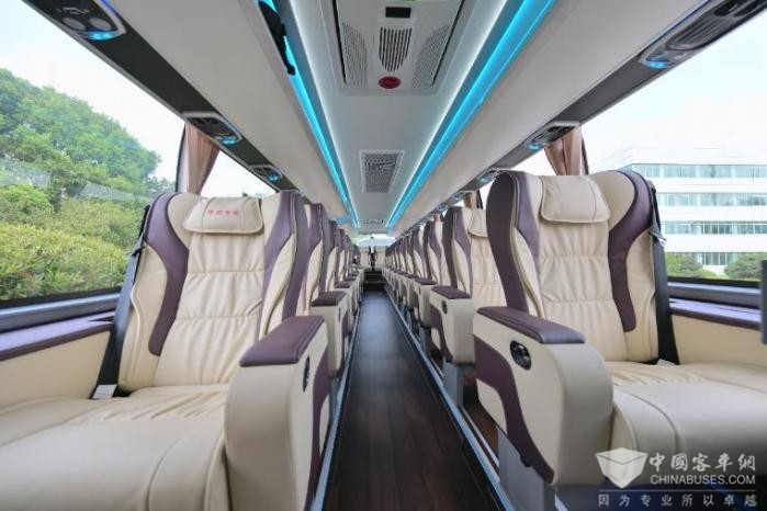 “做高端旅游,细节决定成败。新V系客车内像空调、行李架、冰箱、小吧台这些细节满满的人性化设计,给乘客带来了高端舒适的乘坐体验。” 在配置确定时,秦学也有自己的考量,不求让车处处先进,但求让人处处满意。1+1的座椅布局搭配符合人体曲线的乘客椅,为乘客提供最优质的出行体验;靠窗处设置软包小吧台、杯托,方便乘客放置水杯、手机等随身物品;贯通式行李架增加储物空间,提高行李放置的便利性;整车内饰颜色搭配和照明、氛围灯设计为乘客提供温馨舒适的环境。此外还有15.6寸中控大屏、全液晶仪表、无线充电、司机离座报警等先进配置一应俱全。