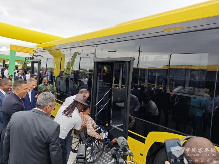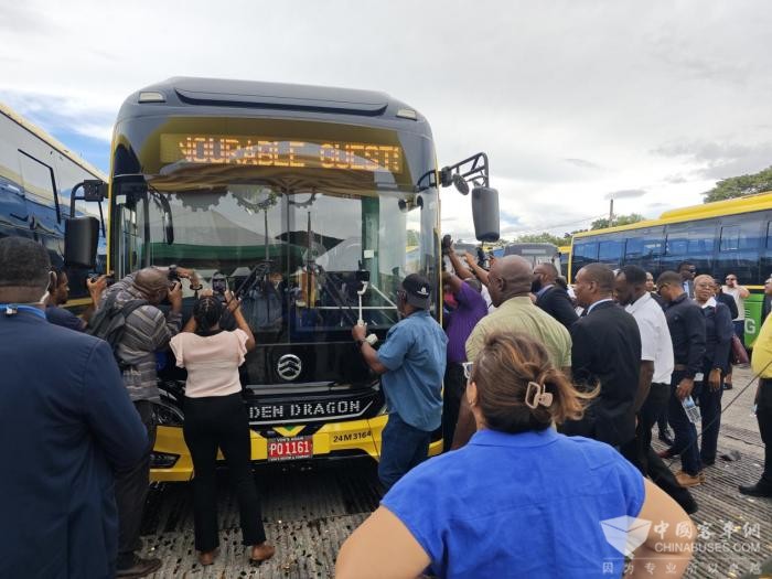 2024年,8月27日,牙买加总理Andrew Holness、财政及公共服务部部长Nigel Clarke,科学、能源、电信、交通部部长Daryl Vaz,圣凯瑟琳残疾人联合会主席Christine Keene一起推扶轮椅,协助一位残障人士经由侧倾的轮椅坡板登上了崭新的公交车。这是当地为抵港后准备投入运行的100辆金旅CNG天然气公交客车所举办的交车仪式当中最激动人心的一环。“我们希望这些公交车为牙买加人民提供更多的公共交通出行便利。” Andrew Holness表示,言语间充满了自豪,现场洋溢着加勒比海所特有的热情与喜悦。就在半年前,Daryl Vaz就通过新闻发布会向牙买加人民预告了这一消息,他表示2024年将有大量公交车陆续上线:“高效、可靠、舒适的交通时代即将到来。”