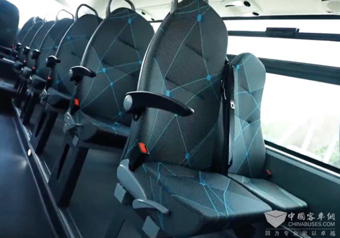 全新H13E客车内饰潮流舒适。59+1座椅布置,提升载客量的同时,仍保证内部空间的宽敞舒适,同时车内座椅采用抗菌环保面料,不仅清新健康,还容易打理。座椅下方则配有USB接口、Type-C接口等各项便利性设计,细致贴心。