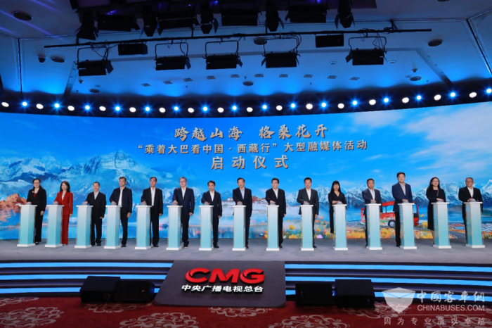 “发车!”2024年10月9日,中宣部副部长、中央广播电视总台台长慎海雄,北京市委常委、秘书长赵磊,西藏自治区党委常委、宣传部部长汪海洲,中国藏学研究中心总干事郑堆,北汽集团党委书记、董事长张建勇等共同启动“跨越山海 格桑花开——乘着大巴看中国·西藏行”大型融媒体活动。