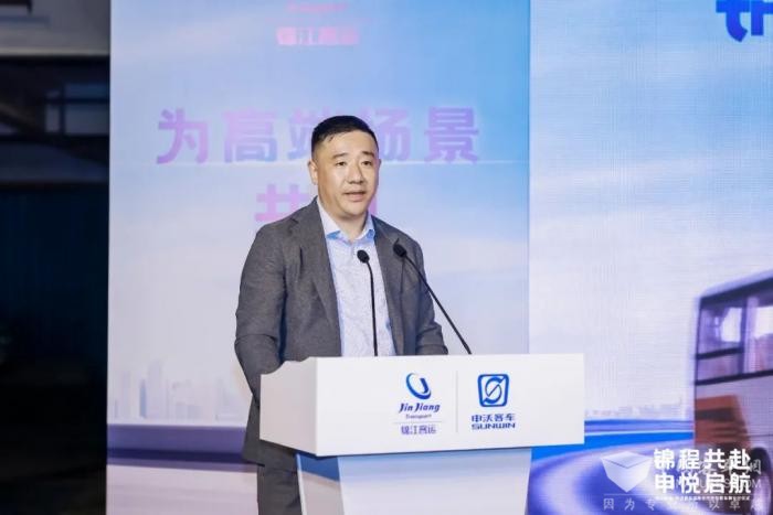 仪式上,锦江商旅与申沃客车相关领导共同为申沃全新研发的新一代11米纯电动旅游车模型揭幕,象征着双方战略合作的纪念。随后,申沃客车技术中心总监阚卫峰介绍了该车型的技术亮点:车辆集成高效能、低能耗与智能化于一体,搭载先进电池管理系统与智能驾驶辅助功能,显著提升续航里程与行驶安全性,为乘客带来舒适便捷的出行体验。申沃客车也将持续加大研发投入,以技术创新推动绿色出行发展。