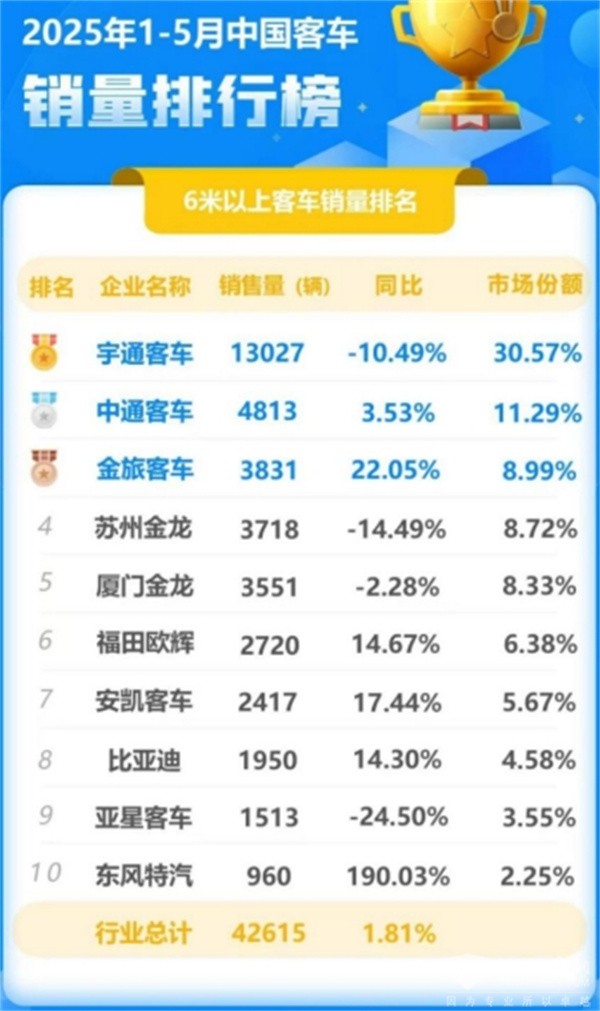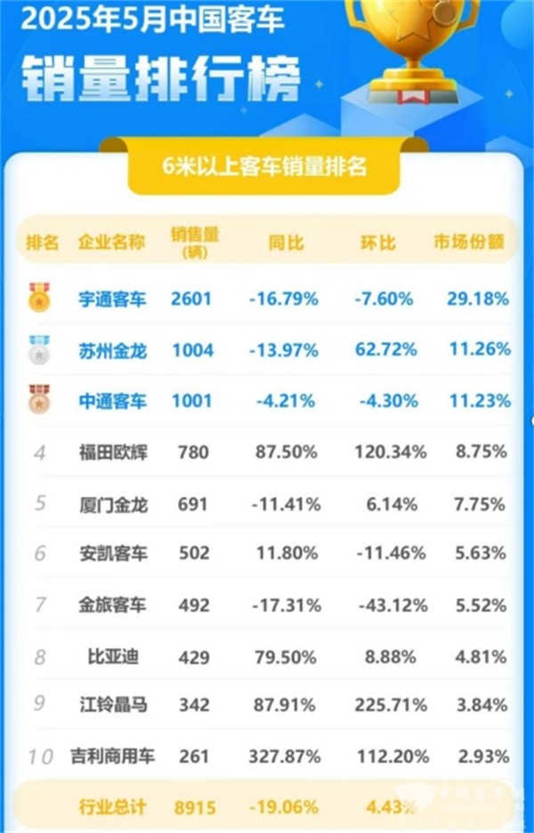 据中国客车统计信息网最新数据显示,2025年5月份,其重点关注的26家客车企业共销售6米以上客车8915辆,同比下降19.06%,环比增长4.43%。其中,宇通客车以2601辆的销售业绩,继续稳居行业第一,市场份额高达29.18%,销量规模远超第二、第三名之和,再次以实力展现了龙头企业强大的市场影响力。