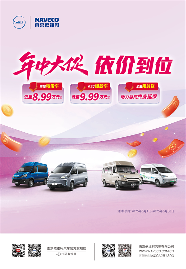 六月的热浪席卷而来,南京依维柯以一场盛大狂欢点燃盛夏购车热情!在这个 618 购物狂欢季,南京依维柯 “年中大促,依价到位” 超值购车福利重磅上线,聚星、得意、欧胜三大车系明星车型全员集结,以巅峰让利之势回馈广大消费者。其中,指定车型售价低至 8.99 万元起,金融贴息、现金直降、置换补贴等多重福利层层叠加,为您带来前所未有的购车钜惠!