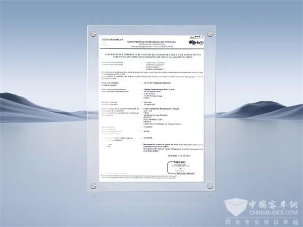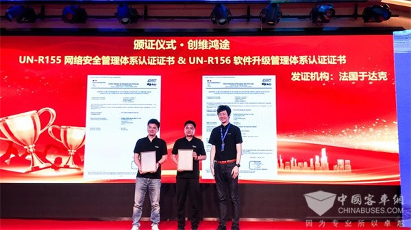 会上,法国于达克中国区副总经理丁春晓向江民总经理颁发了创维鸿途车型UNECER155&ECER156网络安全管理体系证书,标志着创维鸿途在网络安全领域达到国际领先水平,彰显产品安全实力。