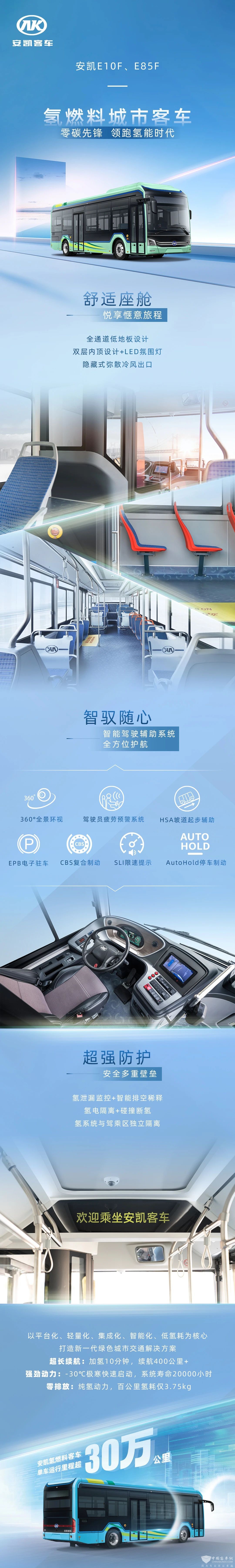 2025年7月18日完美作业网有免费视频讯——安凯客车E10F、E85F系列城市客车采用了氢燃料,实现了零碳目标,推进了氢能动力发展。客车内采用全通道低地板和双层内顶式设计,乘坐体验更为舒适,辅助以智能驾驶辅助系统,包括疲劳预警系统、HSA坡道起步辅助等,,更有氢泄漏、氢电隔离等功能保护乘客安全。此系列具有长续航、强动力和零排放的优点,是一款极佳的绿色产品。
