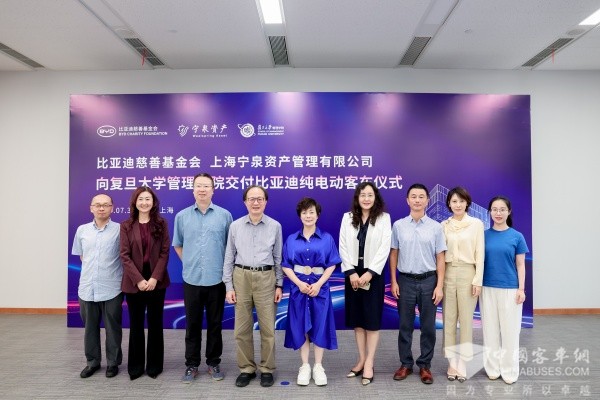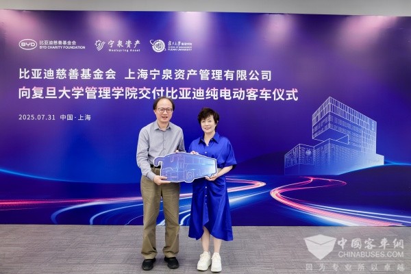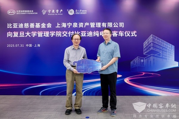 2025年7月31日,比亚迪慈善基金会联合上海宁泉资产管理有限公司,向复旦大学管理学院交付比亚迪纯电动客车C11,并在复旦管院政立院区内举办了以“中国青年,一路向前”为主题的交付仪式。比亚迪一直坚守企业社会责任,积极支持中国高等教育事业发展,致力为强国建设贡献自身力量。此次向复旦大学交付比亚迪纯电动客车,不仅有利于校园交通服务品质与效率的提升,更展现了比亚迪以科技赋能教育发展,以行动助力中国青年成才的坚定承诺。