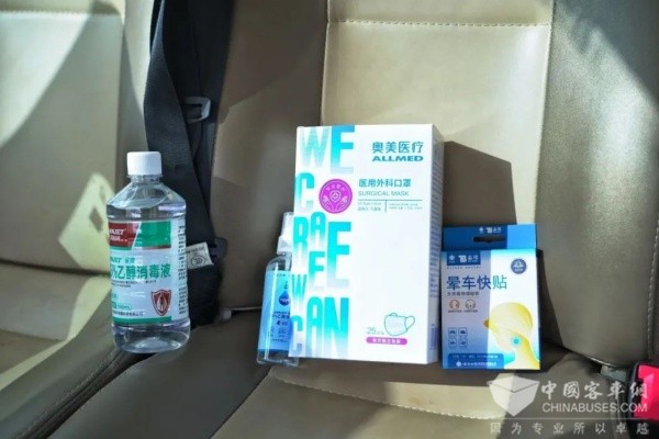 图 ▍健康专线为乘客准备的消毒液、碘伏、晕车贴等