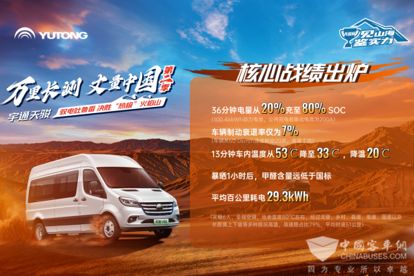 实测高强度,运营更靠谱!当车轮碾过火焰山的赤红岩层,天骏V6E在80℃左右地表烙下中国纯电轻客的品质印记。这场跨越风区、盐泽、沙海、炎火之山的极限征程,既是对产品超强环境适应性的终极答辩,更以耐用、安全、舒适、高效的全维价值体系,验证了中国纯电轻客突破地理与气候桎梏的底层实力。驭电而行,宇通天骏正引领轻客迈入绿色新时代。