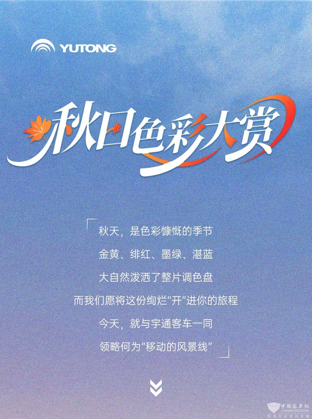 秋天,是色彩慷慨的季节,金黄、绯红、墨绿、湛蓝,大自然泼洒了整片调色盘而我们愿将这份绚烂“开"进你的旅程,今天,就与宇通客车一同领略何为"移动的风景线。