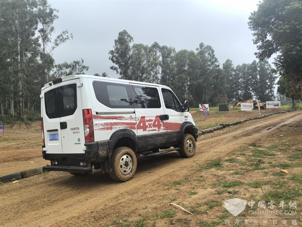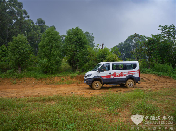 从鸡窝坑脱困而出,经过一段小树林,就来到第二个关卡——交叉轴路段。对拥有全时四驱+三把锁的依维柯欧霸·山海来说,想要通过这一关,其实并不困难,只需在低速四驱模式下锁止中央差速锁,万一遇到单侧后轮打滑的情况也没关系,只要启用后桥差速锁,让两个后轮同步转动,获得相同扭矩,一样可以轻松脱困。