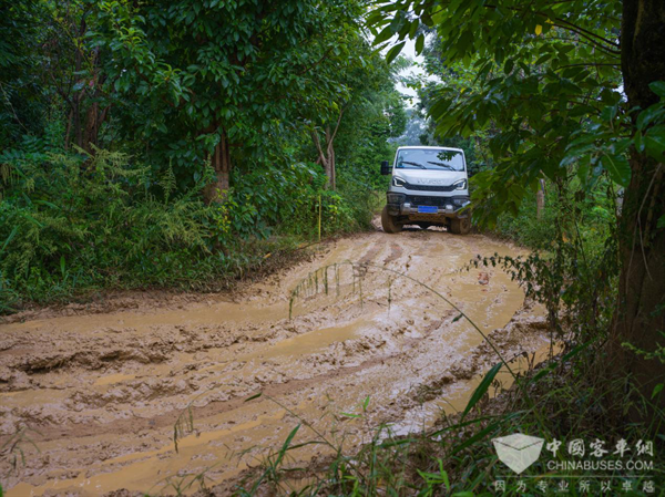 鸡窝坑不大,但难就难在这“不大”二字。因为腾挪空间小,所以一旦陷入其中,就很难脱困出来,对车辆的动力、悬挂、轮胎、车身结构和电子辅助系统等方面,都有着极高要求。说实话,刚开始的时候,我是真没想到能一把就拉起来,依维柯欧霸·山海的越野性能真是太给力了。全地形轮胎提供了稳定抓地力,专业级悬架避免底盘剐蹭、托底,高强度非承载式车身让车辆坚如磐石,一脚油门踩下去,发动机瞬间爆发出430N·m的巅峰扭矩,全时四驱将动能精准分配到每个车轮,只见欧霸·山海一个旱地拔冲,从深坑中一跃而上,雄起!