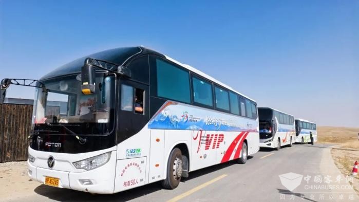 护航本次赛事的福田欧辉11米燃气城间客车,搭载高效天然气动力系统,可提供充沛的动力输出,应对沙漠冲坡、爬坡过坎等复杂地形时,展现出强劲而稳定的动力输出。车辆配备6×260L气瓶,续航里程可达1100公里,不仅续航能力出众还具备优异的节气能力,在保障高效接驳的同时,契合了新疆地区绿色发展的理念。