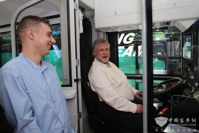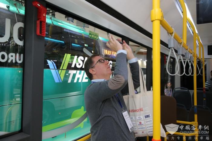 来自塞尔维亚的嘉宾站在Azure12纯电公交内,忍不住拿出手机拍摄车辆顶部。在对比完参展车辆的内饰细节后,他表示中国客车已经具备和欧洲车企同台竞技的实力。