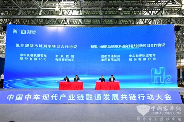 在氢产业链应用场景建设项目签约仪式上,长客股份公司分别与相关单位签署《氢能城际市域列车合作协议》《新型小单轨系统技术研究科技创新项目合作协议》。