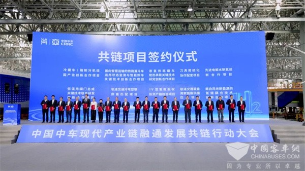 大会举行共链行动项目签约仪式。本次大会共征集“七个聚焦”共链行动项目57项,涉及中车企业与外部合作伙伴共79家。项目类别涵盖供需匹配、协作配套、创新合作、资源共享、产融结合、央地合作多个方向。
