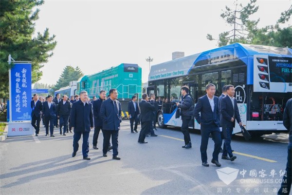 参会主要领导及嘉宾参观了中国中车现代产业链融通发展共链行动主题展。其中,中车氢燃料电池客车的首次亮相即备受关注。该车型搭载行业领先的“氢燃料+锂电池”双能源系统,配备6个140L氢气瓶和100kWh高安全电池,通过氢电协同控制,实现了10-15分钟的极速加氢与高达550km的最大续航,轻松满足全天运营需求。它不仅具备卓越的-30℃低温启动能力以应对各种气候,更以全程零碳排放的环保优势和远低于燃油车的使用成本,为城市提供了绿色、经济、可靠的公共交通解决方案。