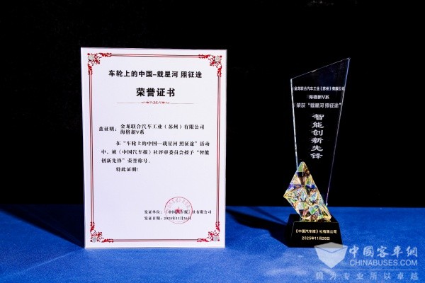 2025年11月26日,由《中国汽车报》主办的“车轮上的中国——载星河、照征途”年度颁奖盛典在北京隆重举行。作为“十四五”收官之年的行业盛会,活动聚焦商用车产业转型成果与创新标杆,对年度表现卓越的企业与产品予以表彰。苏州金龙海格新V系客车凭借领先的智能技术应用与卓越的市场表现,在评选中脱颖而出,荣膺“智能创新先锋奖”,彰显了企业在客车智能化、高端化发展中的创新实力与行业担当。
