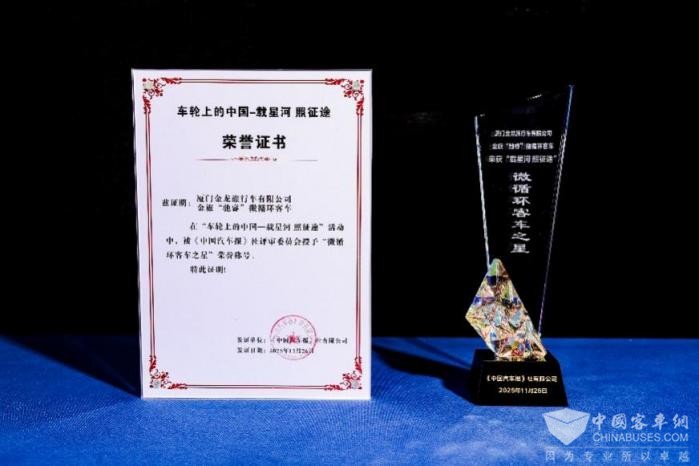 2025年11月26日,由《中国汽车报》主办的2025商用车产业合作发展大会在北京召开,会上“车轮上的中国——载星河、照征途”年度颁奖盛典隆重举行。本次盛会在“十四五”收官之际,以“总结转型成就、树立创新标杆”为主题,通过对商用车行业在产品创新、市场应用等多维度的综合评估,评选出一批具有行业代表性的优秀企业与产品。厦门金龙旅行车有限公司(以下简称“金旅”)旗下两款明星车型——金旅“凯旋”纯电动大型豪华客车与金旅“驰睿”微循环客车,凭借出众的产品力与市场表现,分别荣获“商务接待先锋”与“微循环客车之星”荣誉称号,展现出金旅在客车领域的领先实力与创新活力。