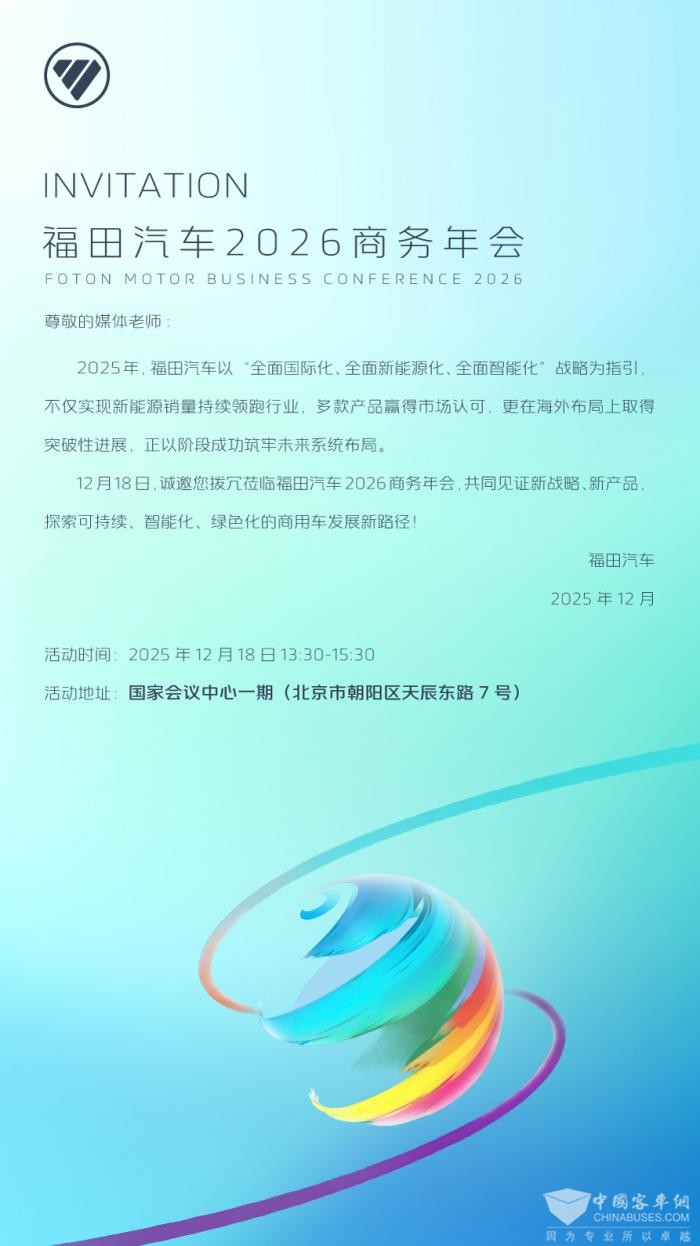 以2026商务年会为新起点,福田汽车将持续以创新进取的精神内核,加速“三个全面”战略转型,进一步提升核心竞争力,向世界一流商用车企业目标稳步迈进。12月18日,数千名权威媒体、合作伙伴、战略客户和经销商代表将在北京国家会议中心共同见证这场行业盛事,福田汽车官方视频号、抖音号也将全程直播盛况。让我们共同期待,福田汽车在新的发展阶段,持续领跑商用车行业,书写世界一流商用车企业的崭新篇章!