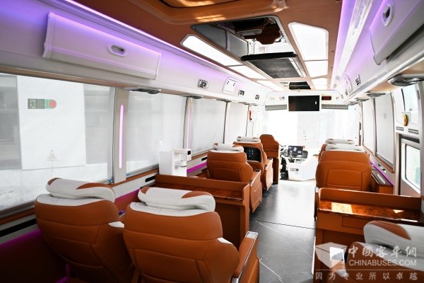 当下,旅游市场正经历从“传统跟团游”向“高端私人定制游”的结构性转变。“海格公路和谐号”精准洞察这一市场变化,以前瞻性的产品定位直击行业痛点。车内精心布局“2 + 1”或“1+1”大商务座椅,选用顶级舒适材质,依据人体工学原理进行设计,具备多角度调节功能,让乘客能够轻松找到最惬意的坐姿,在旅途中尽情放松身心;定制星空顶搭配智能氛围灯,可灵活切换色彩、亮度,将科技与艺术完美融合,点点星光营造出如梦如幻的氛围,增添浪漫与温馨,尽显格调品味;贴心配备的高端商务办公桌,为移动商务场景量身打造,乘客可以在旅途中处理工作事务,实现工作与旅行的完美平衡;高级定制空调出风口,精准调节风向与风量,应用超级静音技术,营造舒适静谧的乘车环境。