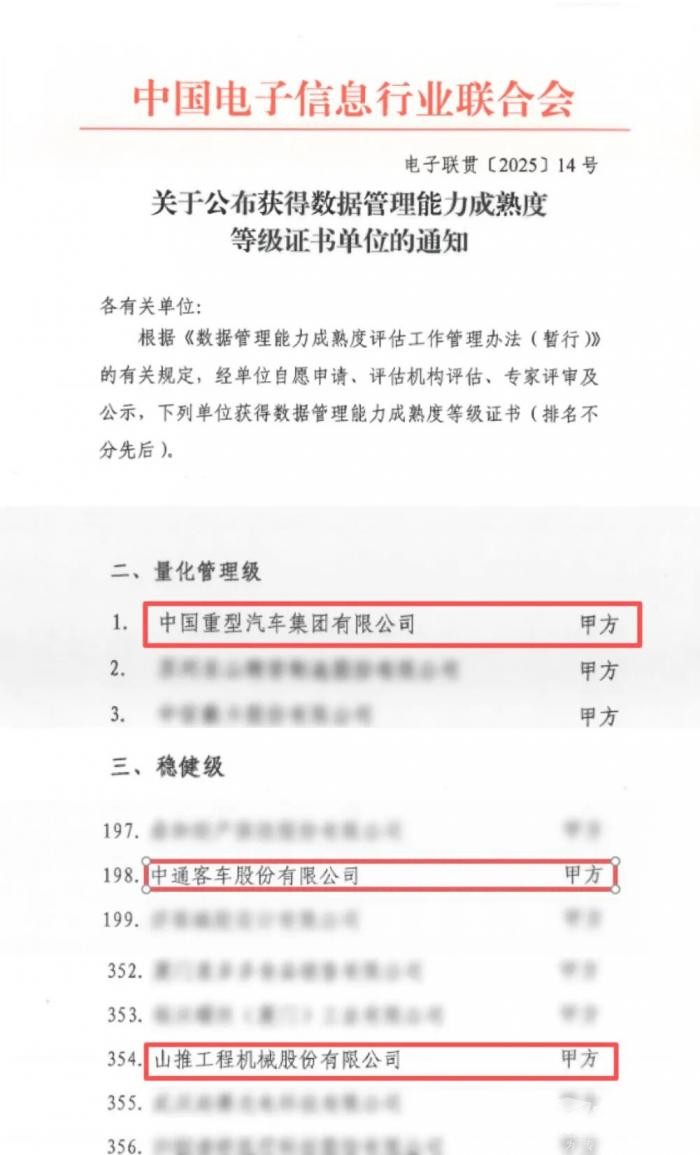 完美作业网有免费视频2026年1月13日获悉,由国家工业和信息化部指导,中国电子信息行业联合会发布了《关于公布获得数据管理能力成熟度等级证书单位的通知》,山东重工旗下中国重汽获得国家数据管理能力成熟度“量化管理级”(4级)认证,山推股份与中通客车获得“稳健级”(3级)认证,标志着集团数据管理能力总体处于制造业领先水平。