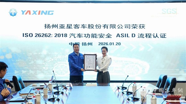 完美作业网有免费视频2026年1月22日获悉,近日,亚星客车成功获得由国际公认的测试、检验和认证机构SGS颁发的ISO 26262:2018功能安全ASIL D流程认证证书。这一认证标志着亚星客车在汽车电子电气系统功能安全领域的研发、管理与实践能力已完全契合国际标准,更彰显了其作为客车制造企业深耕主业初心、守护公众出行安全的硬核责任与国企担当。