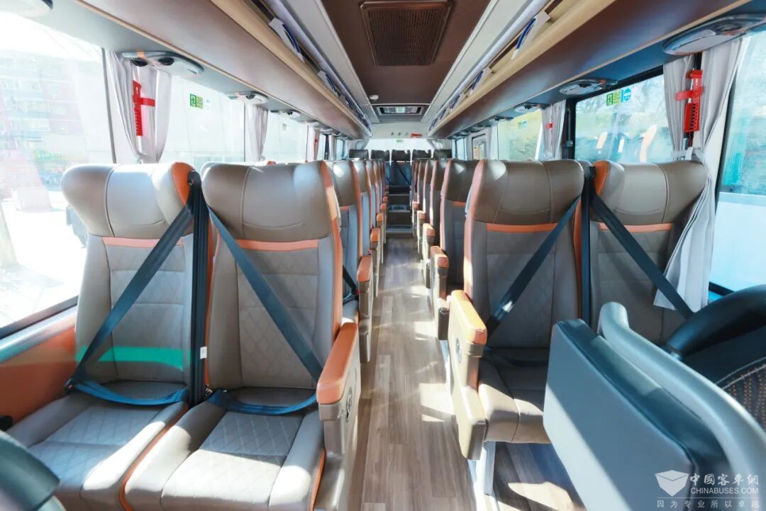 采用中空玻璃,有效隔热防紫外线,适应强烈光照与温差变化。车内配备人体工学座椅、多色氛围灯、冷暖空调(部分车型可提供1+1豪华大商务座椅布局),并搭载液晶电视、快充接口、饮水机等设施,致力于为旅客打造极致舒适与便捷的“移动会客厅”。