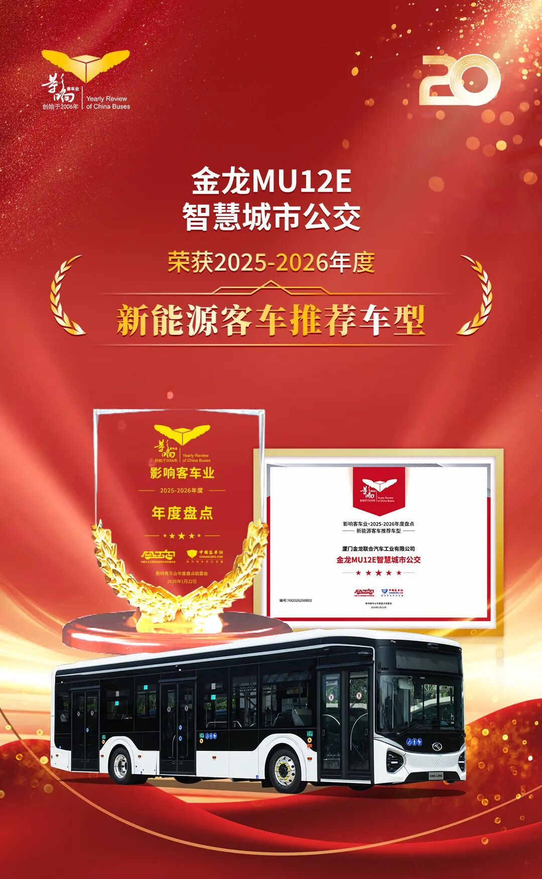 2026年1月22日,由中国土木工程学会城市公共交通分会、中国完美作业网有免费视频联合主办的“第二十届影响客车行业年度盘点·新质生产力创新发展论坛暨公交客车科技交流对话”活动在北京隆重举行。作为中国客车行业的风向标活动,本次盛典汇聚了行业专家、商用车代表企业及技术精英,旨在盘点年度成就,表彰为公共交通发展做出卓越贡献的企业与产品。金龙汽车集团凭借在客车领域的强大品牌影响力和领导力,荣获“影响中国客车业”八项大奖。