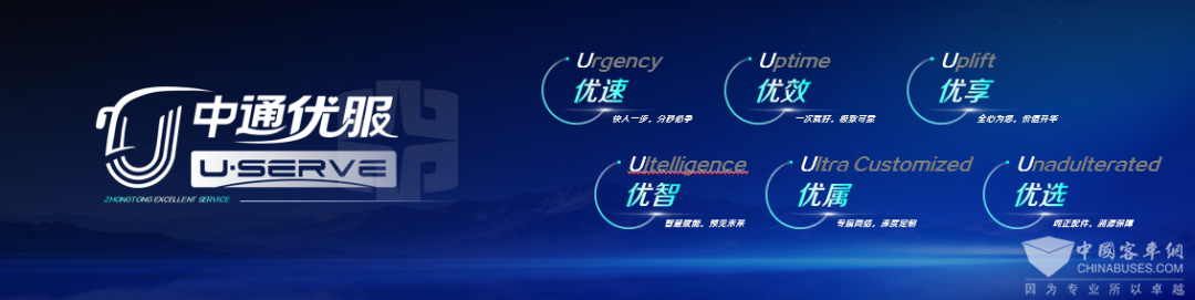 当前,客车行业竞争已从“产品为王”迈向“服务制胜”,服务体系成为影响用户全生命周期体验的关键。“中通优服 U・Serve”作为中通客车重磅推出的服务品牌,也亮相活动现场。中通优服以优速、优效、优享、优智、优属、优选六大服务支柱,构建起全维度服务能力体系。