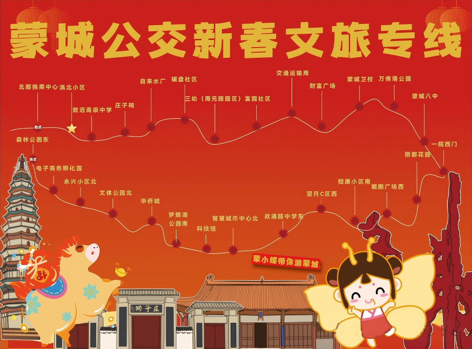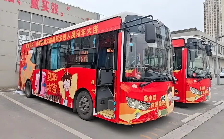 蒙城新春文旅专线以安凯客车为核心载体,通过定制化设计,将马年新春的喜庆元素与庄子文化、城市地标深度融合,让车辆穿行于街巷景区,成为极具地域特色的文化符号。