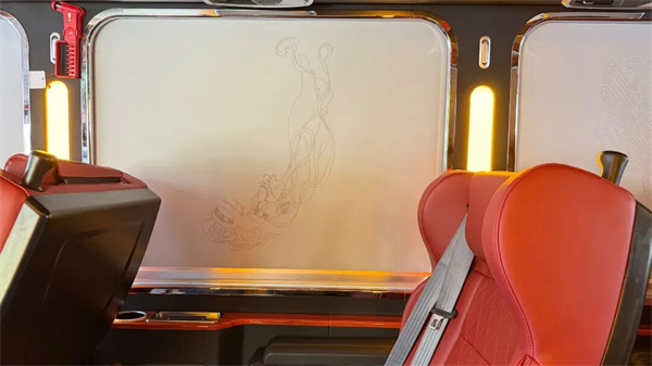 值得一提的是,车内还配置浪漫星空顶、精致高铁式刺绣窗帘、车载冰箱、KTV 娱乐系统等,其中刺绣遮阳帘再现敦煌壁画飞天仙姿,光影间尽显思路风华,让每段行程都浸润着古韵与诗意。针对甘肃及西北地区的高海拔运营特点,还专门配备弥散式制氧机,全面满足高海拔运营需求,守护每一段旅途舒适与安心。整车不仅全面适配长途旅行场景,更兼顾舒适、健康、艺术与休闲多重需求,尽显人文温度和品牌匠心。