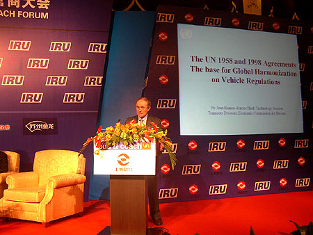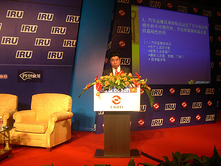 Dotson先生、北京公共交通控股(集团)有限公司总裁副总经理冯幸福先生、中国新国线运输集团有限公司董事长王永立先生分别就中国城市公共交通发展(协调基础设施投资与土地使用规划为综合公共交通网络铺平道路的政策)、北京的流动性概念(迎接城市交通和城市间流动性需求不断增长的挑战)与由客车进行的城市间客运(确保中国人口流动性的关键角色)做了精彩演讲。在第二组会议谈论"中国制造"如何赢利。联合国技术委员会技术部主任Juan