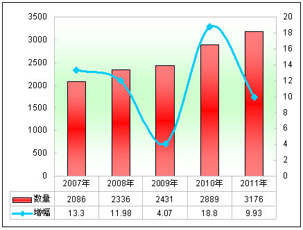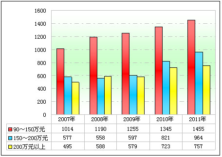 从2007年到2011年,价格在90万以上的客车销量从接近的2086辆逐步发展到近3200辆的规模,2007年销量超出2000辆,达到2086辆,2008年达到2336辆,2009年由于金融危机的影响,高档客车销量仍然呈现小幅度的增长,2010达到2889辆;从近几年的度情况来看,高档客车遵从了与相应年份的整体客车市场发展同样的规律—均为正增长。近5年来度销量增幅最大的是2010年,其次是2007年,再次是2008年,增幅最小的是2009年(2009年由于经济危机影响)。