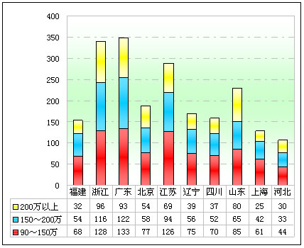 4、江苏是高端客车市场需求量第三大的区域市场,整体集中度为9.11%。具体为:对价格在90~150万区段的需求的集中度是8.66%,是所有区域市场中集中度第二大的细分市场;对价格在150~200万的区段的需求的集中度是9.75%,对价格在200万以上的区段的需求的集中度是9.11%,也就是说,在江苏区域市场,价格在90~150万的集中度为最小,150~200万集中度最高,200万以上区间的产品市场集中度次高,市场份额仍然不小,因此,高端客车生产企业对江苏区域的营销策略也不容忽视,因为该区域对高端客车市场需求的机会也不小,主要因为江苏是华东重要的发达市场,而且高端旅游车的需求也是最大的,无疑拉动了对高端客车市场的需求。