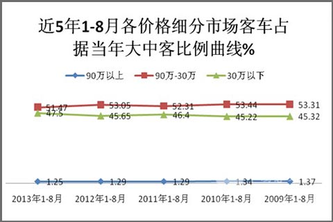 3、2013年1-8月由于国家城乡一体化战略的开始实施,导致城乡公交市场大幅度增长(达到59.20%,见表3,可以看出2013年1-8月城乡公交增长的幅度是近6年来最大的年份,是促进2013年公交市场增长的主要力量,是公交市场的生力军),而城乡公交产品的价格绝大部分都在30万以下,因此必然导致30万以下客车市场比例的增加,而30-90万的中高档客车比例就必然被蚕食,因此而减少。