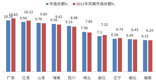 从上表看出,2013年1-10月,上述十大区域11-12米公路客车销量为11683辆,占据整个公路客车市场的比例为83.11%,比去年同期稍有降低的迹象,说明市场集中度有所降低。其中广东、江苏、山东是11-12米公路客车的销量为前三名,这3个区域11-12米公路客车占有的市场份额29.94%,接近30%,但比2012年同期(去年同期为30.56%)有所降低,大致原因: