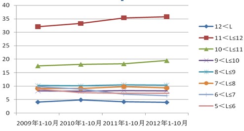 从上图表看出:近4年1-10月,11-12米公路客车比例在逐年加大,呈现逐步上升态势,但这种趋势有越来越弱的迹象,到了2013年出现拐点,比例下降。原因大致如下: