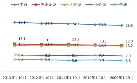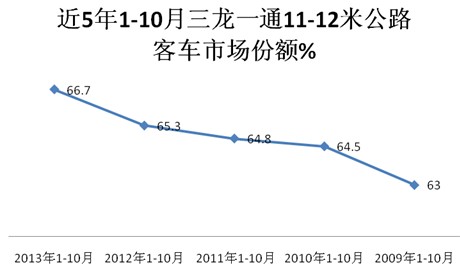 6、 2013年1-10月三龙两通等主流公路客车企业的公路客车总量占据整个公路市场的集中度为66.7%,而去年同期其集中度为65.3%,今年1-10月市场集中度同比上升了1.4个百分点,另外近5年1-10月垄断程度在逐年加强。一方面说明三两通等主流公路客车企业是公路客车的绝对垄断者,同时其垄断地位还在加强,这也从一定程度上说明了三龙两通等强势公路客车企业强者愈强的局面正在形成,其他公路客车企业竞争压力越来越大。