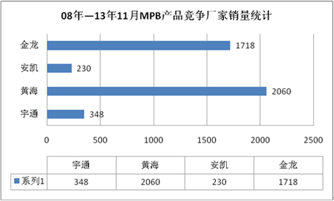 黄海客车起步较早,前几年主要受地方特殊需求销售较好,近2年销售下滑;厦门金龙起于北京八方达公司,这几年销量不错,宇通客车起步较晚,但市场发力较快。
