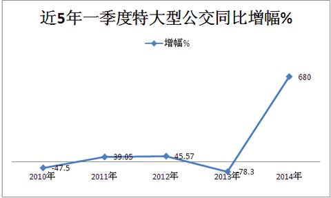 2014年特大型公交的增幅达到680%,增量近700辆,在所有长度段中增幅增量均最大,可谓鹤立鸡群,也是近5年一季度以来特大型公交中同比增幅最大的,可谓呈现出"井喷"式增长,是名副其实推动2014年一季度公交市场整体增长的中坚力量。