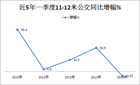 第一季度11-12米大型公交降幅为9.97%,是自从2010年一季度以来近5年中首次出现负增长,而且下滑幅度接近10%。