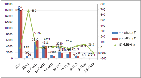 2014年一季度公交客车在各长度段的同比销量增幅统计表2