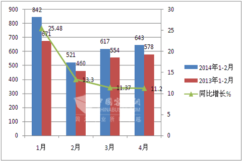 1、1-4月LNG客车各月销售数据分析。根据上牌数据,2014年1-4月销售6米以上LNG客车共计2623辆,比去年同期的2263辆,增幅近16%,各月LNG客车(含6米及以上)销售数据统计表: